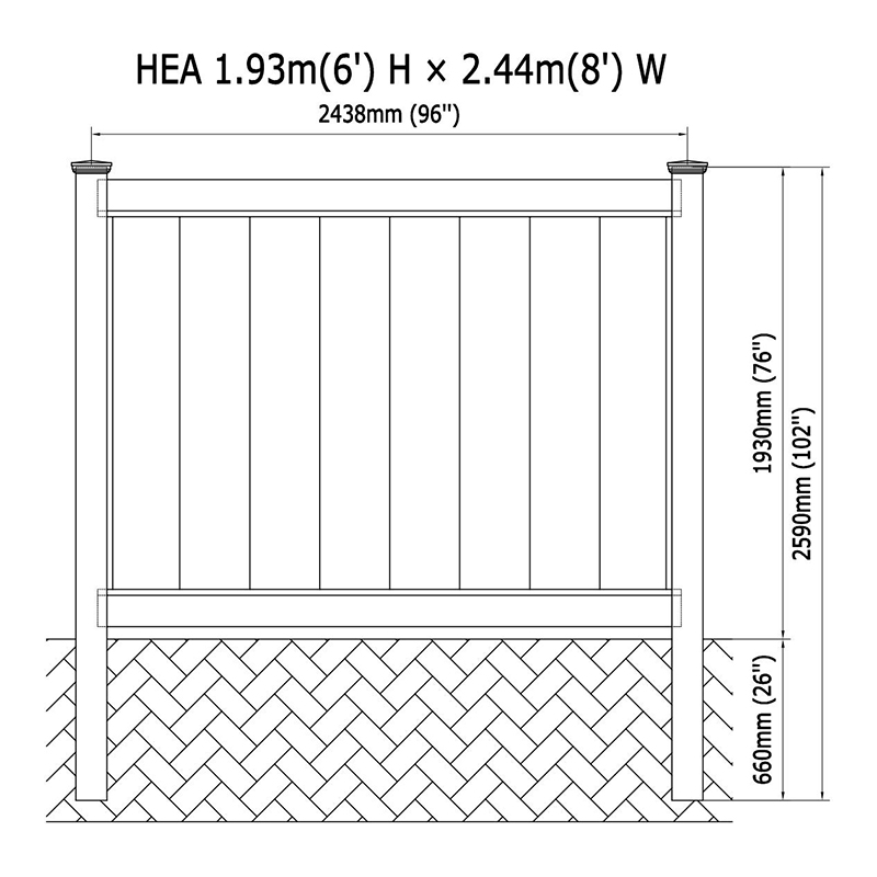 Çit, 4 "x 4" veya 5 "x 5" deki dayanıklı direklere sahip, isteğe bağlı yükseklikleri 102 inç'e kadar olan dayanıklı direklere sahip. Her yazı, hat, uç, köşe, 3 yol veya boş yapılandırmalar için tasarlanmış kolay kurulum için önceden oluşturulur. Alt ve üst raylar, kolaylık sağlamak için önceden çıplak olan sağlam 2 "x 6" x 94 "parçalardan yapılmıştır. Alt rayda bir alüminyum ek, ticari sınıf dayanıklılığı sağlayarak mukavemetini artırır.